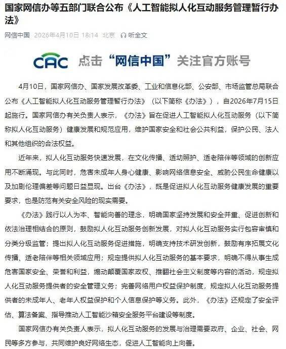 长沙晚报掌上长沙4月10日讯 据“网信中国”微信公众号消息:4月10日,国家网信办、国家发展改革委、工业和信息化部、公安部、市场监管总局联合公布《人工智能拟人化互动服务管理暂行办法》(以下简称《办法》),自2026年7月15日起施行。国家网信办有关负责人表示,《办法》旨在促进人工智能拟人化互动服务(以下简称拟人化互动服务)健康发展和规范应用,维护国家安全和社会公共利益,保护公民、法人和其他组织的合法权益。近年来股票配资门户平台社区,拟人化互动服务快速发展股票配资门户平台社区,在文化传播、适幼照护、适老陪伴等领域的创新应用不断涌现。与此同时,危害未成年人身心健康、影响网络信息安全、威胁公民生命健康以及加剧伦理偏差等问题日益显现。出台《办法》,既是促进拟人化互动服务健康发展的重要要求,也是防范有关安全风险的现实需要。《办法》践行以人为本、智能向善的理念,明确国家坚持发展和安全并重、促进创新和依法治理相结合的原则,鼓励拟人化互动服务创新发展,对拟人化互动服务实行包容审慎和分类分级监管;提出拟人化互动服务促进措施,明确支持技术研发创新,鼓励有序拓展文化传播、适老陪伴等相关领域应用;规定提供拟人化互动服务的基本要求,明确不得从事生成危害国家安全、荣誉和利益,煽动颠覆国家政权、推翻社会主义制度等内容的活动,规定拟人化互动服务提供者的安全管理义务;完善网络用户权益保护制度,规定拟人化互动服务提供者的未成年人、老年人权益保护和个人信息保护等义务。此外,《办法》还规定了安全评估、算法备案、指导推动人工智能沙箱安全服务平台建设等制度。国家网信办有关负责人表示,拟人化互动服务的发展与治理需要政府、企业、社会、网民等多方参与,共同维护良好网络生态,促进人工智能向上向善。